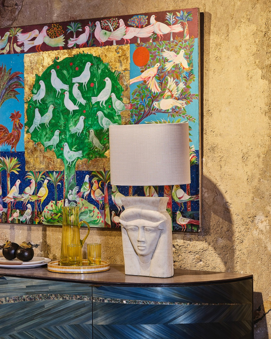 Inspired by the goddess of beauty and joy, the Hathor lamp is carved from luminous alabaster stone, radiating a soft, natural glow. Its minimal, oval-shaped shade adds a touch of modern serenity to this timeless piece.