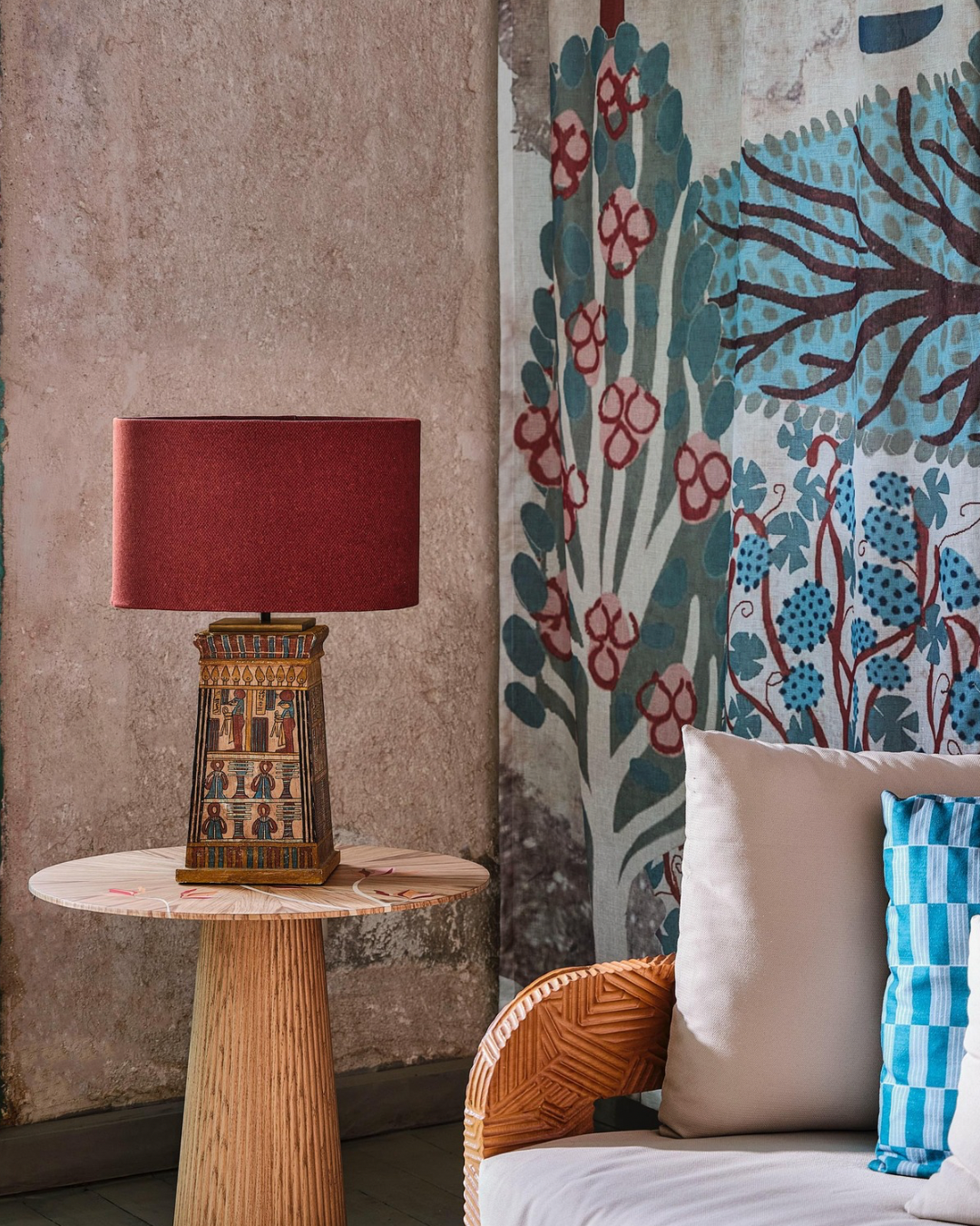 One of a Kind, A tribute to Horus, this sculptural lamp captures the divine elegance of the falcon in flight. The hand-painted base is adorned with sacred figures and motifs reminiscent of temple walls, brought to life with warm, earthy tones. Topped with a deep red fabric shade, it casts a soft, grounding glow—like dusk falling over ancient sands. A piece that carries the spirit of protection, vision, and timeless beauty.