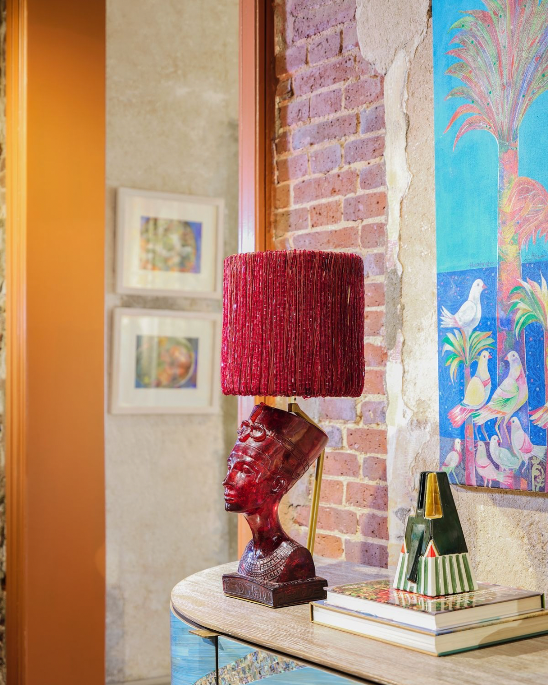 A bold tribute to the legendary queen Nefertiti, this sculptural lamp features a crimson fatoran powder stone base and a handwoven red thread and Beads shade. Striking, elegant, and full of character - designed to light up your space with timeless power.
